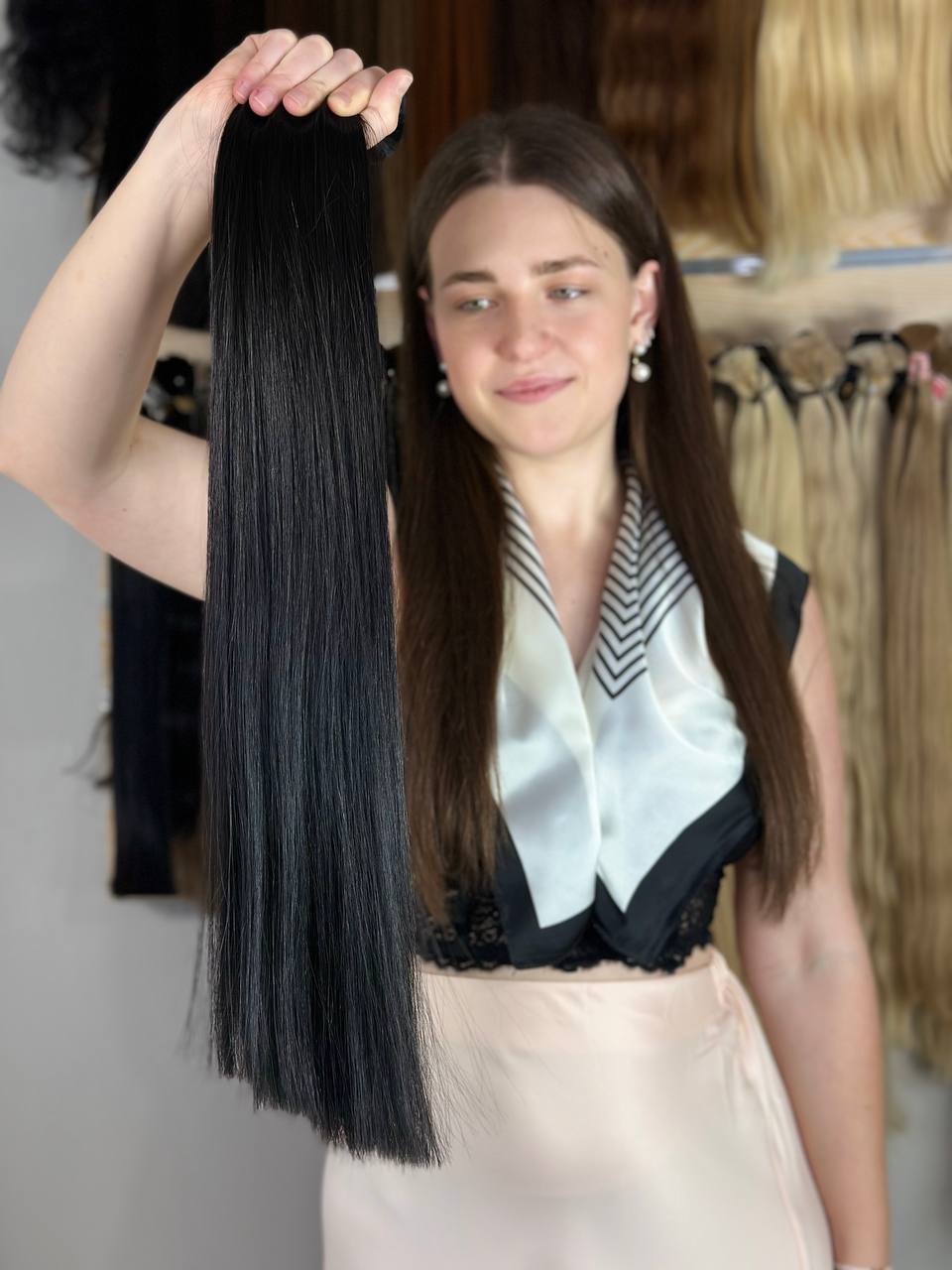 Premium Slavic hair. Dyed, thick ends, black color. Single-drawn cut. Straight, but it’s a natural unprocessed texture that can be styled into any shape.